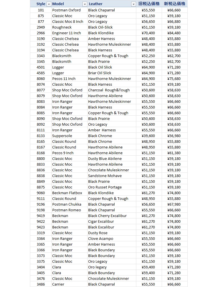 | Style | Model | Leather | 旧税込価格 | 新税込価格 |